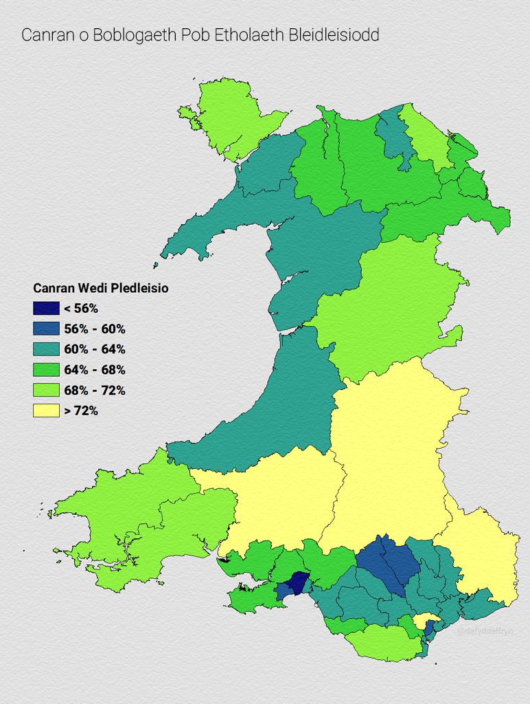 Yr ardal gyda’r nifer lleiaf oedd Dwyrain Abertawe, gyda dim ond 54.62% o’r boblogaeth wedi pleidleisio.