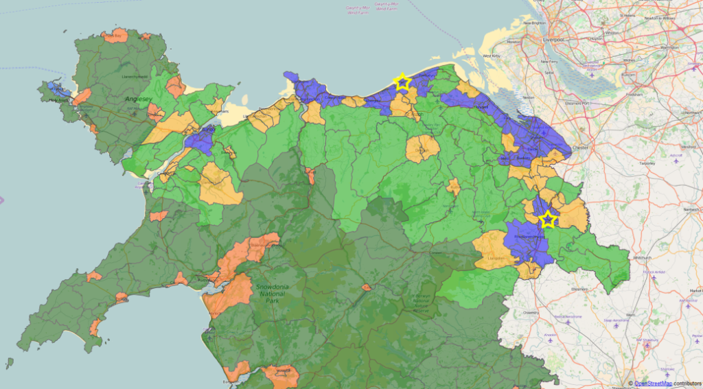 Er bod cymaint o Gymru yn ardal wledig yn ôl yr ONS – dyw’r data ddim i weld yn cefnogi dadl Llafur bod gweddill Gogledd Cymru – ar ôl Rhyl – rhu wledig i gael eu cynnwys gan y Metro. Mae’r map isod yn dangos yn gliriach arfordir y gogledd (dwi wedi rhoi sêr ar Wrecsam a Rhyl):
